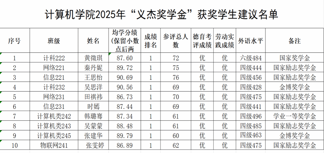 依据《海南劲恒私募基金管理合伙企业—中原工学院关于设立“义杰”奖学金的协议》及《“义杰”奖学金评审实施细则》评审标准和程序,经学生本人申请、计算机学院“义杰”奖学金评审委员会审议,建议获奖名单经海南劲恒私募基金管理合伙企业确认,现予以公示。公示期2025年12月2日-12月4日,监督电话037162506615,有异议者请在公示期内实名向学院反馈。