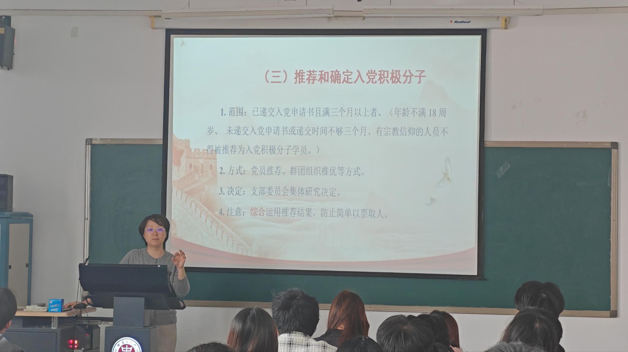 姜茜老师以“严把入口关,筑牢源头基”为开篇,强调发展党员工作是党的建设源头工程,程序性、政治性极强,直接关系党员队伍的先进性和纯洁性。随后,她按“申请—培养—考察—审批—转正”的逻辑主线,详解各阶段关键流程。
