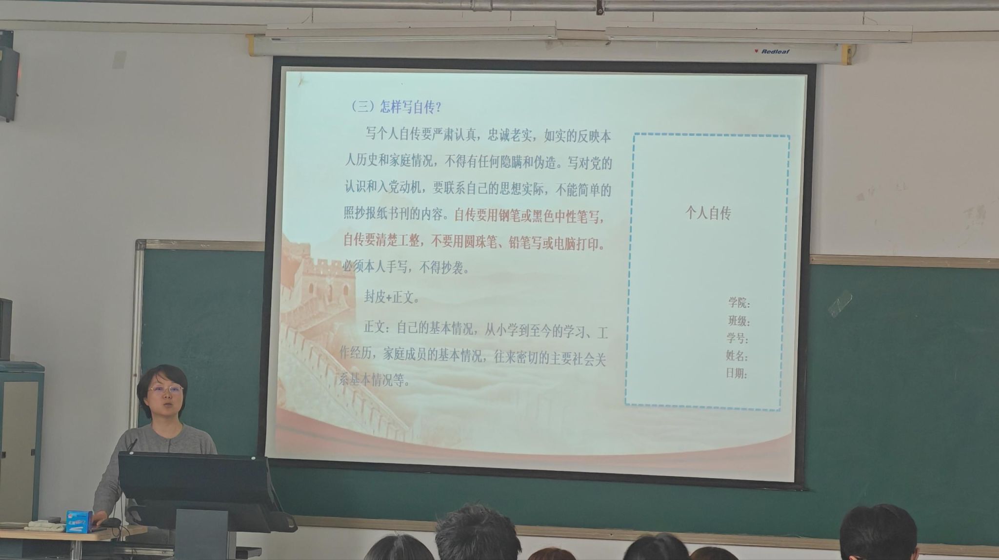 随后,姜老师结合计算机学院学子特点,特别强调三点要求:一是要强化程序意识,严格遵守每一步流程规范,确保材料齐全、手续完备;二是要立足专业特色,将党性修养融入专业学习与科研实践,以技术报国的担当践行入党初心;三是要注重日常积累,认真撰写思想汇报,主动接受党组织考察,做到言行一致、表里如一。